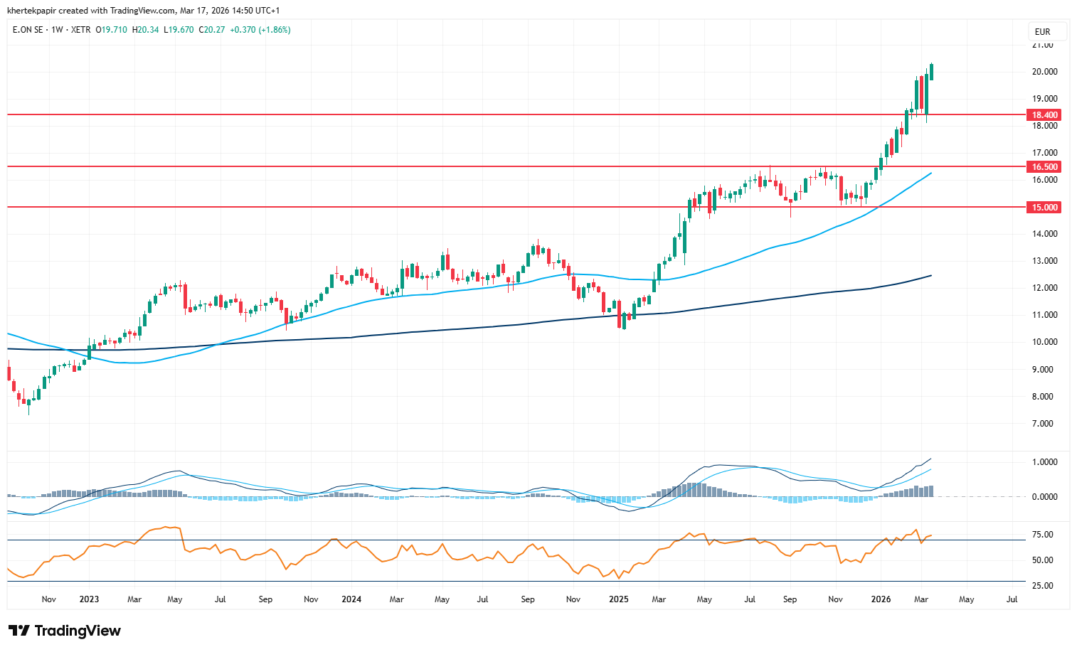Heti bontásban jól látszik, hogy 2025 második felében a 15 és 16,5 euró közötti sávban mozgott az E.ON részvénye, amiből éppen idén év elején tudott kitörni. A lendület eddig töretlen, de kérdés, hogy meddig tarthat ki az emelkedő trend. A 20 eurós szint ugyan többéves csúcsot jelent, de a történelmi csúcsát még 2008-ban jelölte ki a részvény 40 euró felett. Az már kevésbé kedvező, hogy a Bloomberg elemzői konszenzusa jelenleg 19 euró körüli célárat határoz meg, igaz, az idei évben rendre a konszenzusos célár felett tudott mozogni az E.ON részvénye.