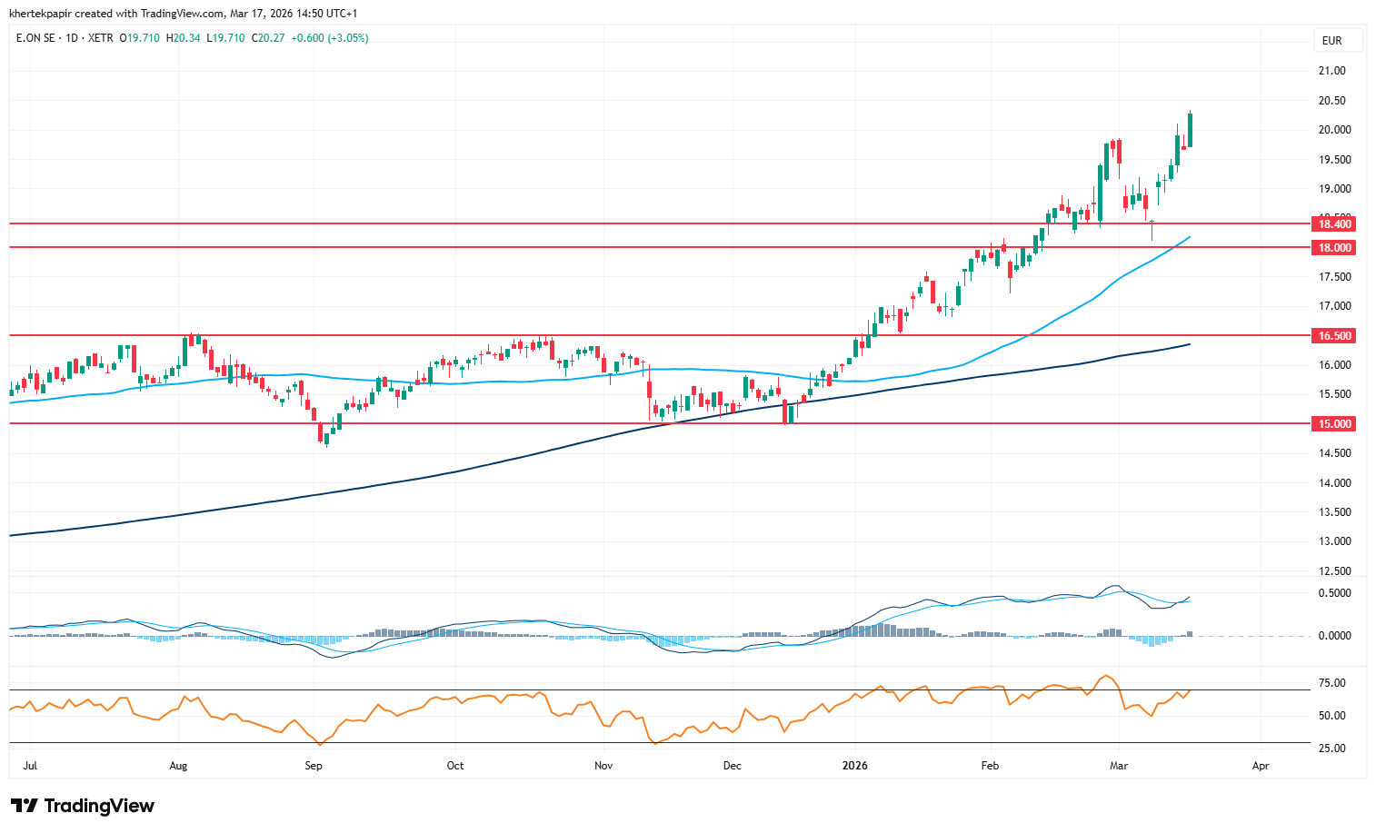 Az év tehát kedvezően alakult eddig, így a mai nappal már a 20 eurós szintet is átlépte az E.ON részvénye, ezzel év eleje óta 25 százalékot erősödött. Az idei emelkedés szinte töretlen, bár a márciust az E.ON részvénye is gyengébben indította, az előző héten már újra az emelkedő trend folytatódása látszódott.