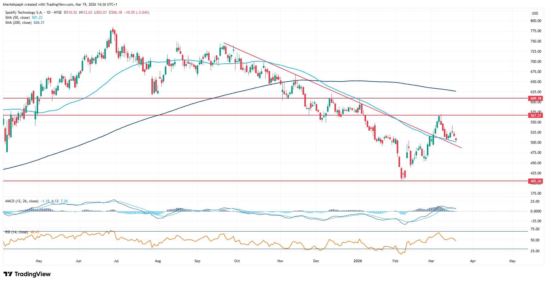 Közeli ellenállást a hetekben kijelölt 570 dollár körüli lokális csúcs képezhet, de ennek áttörésével a 600 dollár feletti szinteket vehetné célba a Spotify. Az indikátorok kapcsán nem látni szélsőséges értékeket, az elmúlt hónap során is mélypontokról tudott fordulni az RSI, illetve az MACD is.