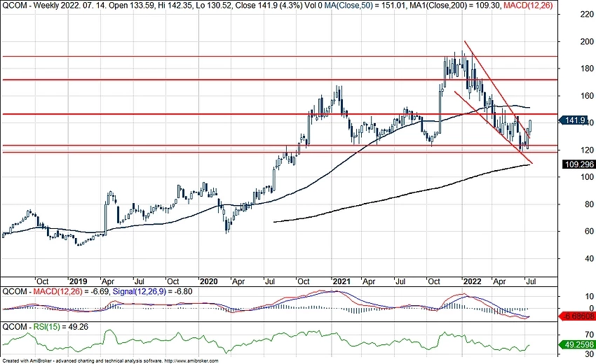 Érdemesebb először a hosszabb távú grafikont megvizsgálni közelebbről, majdnem a 200 hetes mozgóátlagig esett vissza a kedvezőtlen nemzetközi hangulat közepette idén a részvény árfolyama. Időközben egy csökkenő ék alakzat rajzolódott ki a grafikonon, amelyből kitörni látszik a részvény, ez akár újabb lendületet adhatna a papírnak, hogy célba vehesse a korábbi lokális csúcsokat. Az 50 hetes mozgóátlagon való átjutás lehet az első komolyabb feladat a Qualcomm számára, ezt követően a 161, illetve a 188 dolláros szintekkel küzdhet meg a részvény.