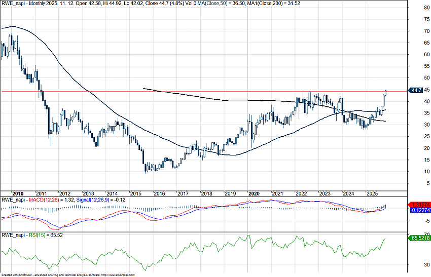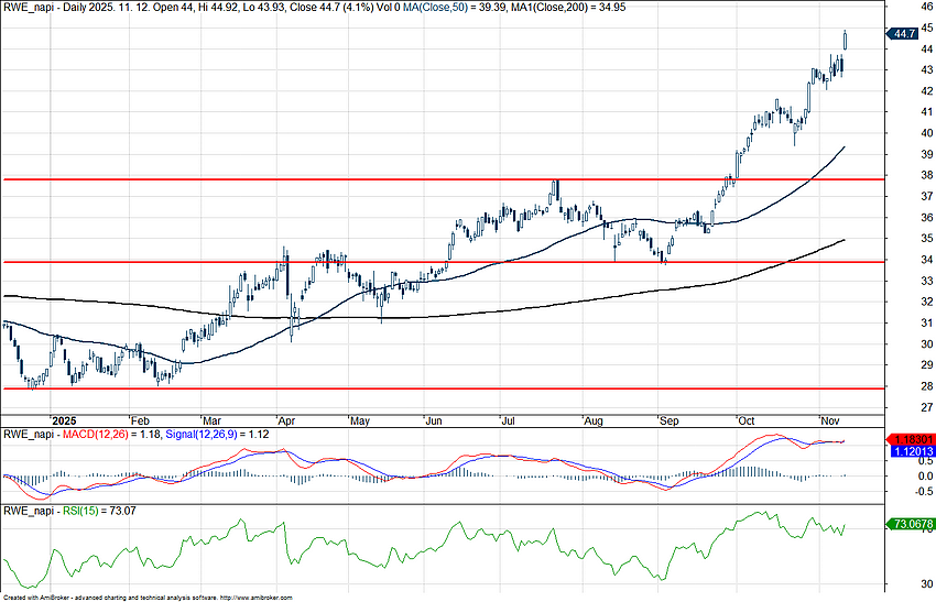 Az RWE havi grafikonja (2025. 11. 12. 13:30)