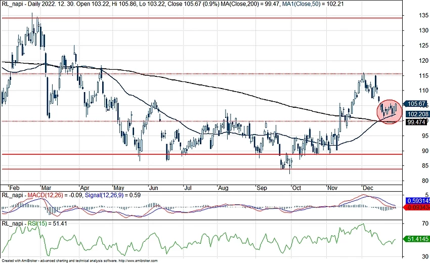 A napi grafikonon kialakult az aranykereszt képe, vagyis ez akár trendfordulót jelezhetne előre, hiszen az 50 napos mozgóátlag ismét a lassabban mozgó 200 napos átlag fölé került. Emellett az év utolsó napjaiban segítséget is nyújtott az 50 napos mozgóátlag a részvénynek, mivel itt torpant meg a visszaesés, és tudott ismét elindulni felfelé az árfolyam. Feljebb a korábban említett 115 dolláros szint áttörése, illetve a 135 dollár körüli szintek elérése lehet a célja a részvénynek.