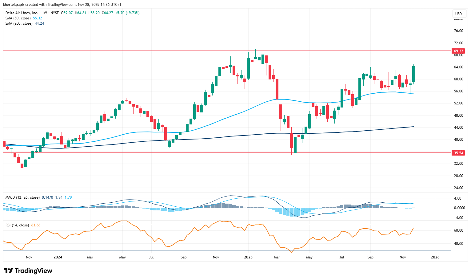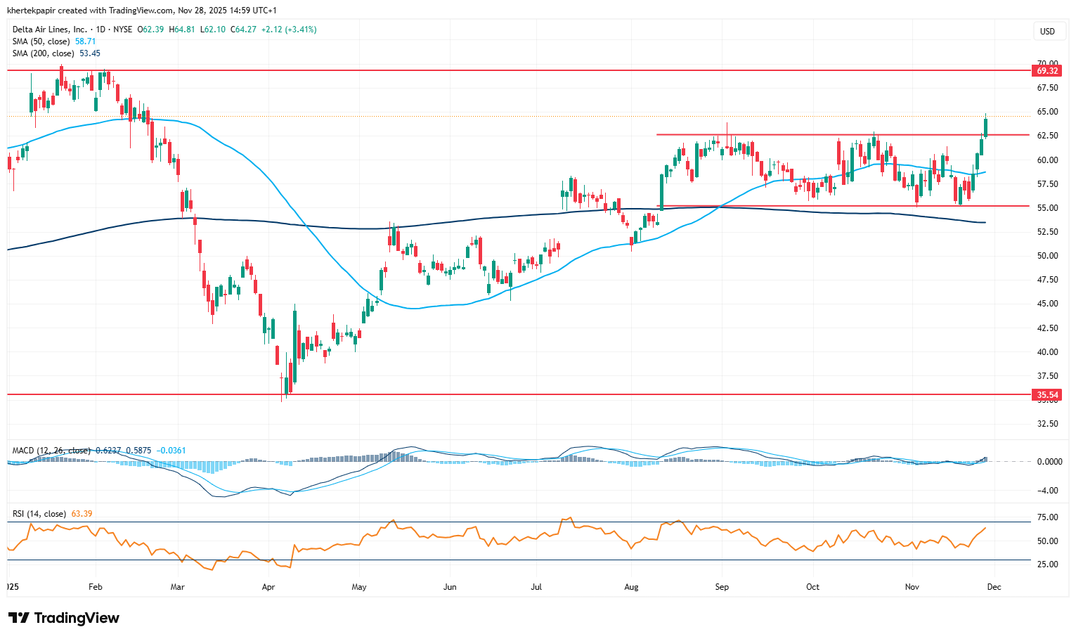 A nagyobb lendületnek köszönhetően a Delta napi árfolyama sikeresen kitört abból a sávból, amelybe augusztus közepe óta ragadt be, és amelyet többször is próbált elhagyni. Ezzel megnyílt a tér az árfolyam előtt, így következő ellenállásként az év eleji csúcsokat célozhatja meg a részvény, 70 dollár környékén.