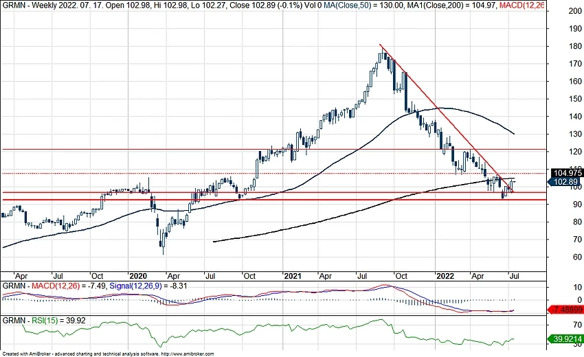 Tavaly óta a piaccal együtt csökkenő trendben mozog a Garmin árfolyama, viszont a napokban az 50 napos mozgóátlag áttörésével próbálkozott a részvény. A fundamentumok terén stabil növekedés látszódik az értékesítésekben, és az árfolyamesés miatt a részvény értékeltsége sem magas, az S&P 500-zal megegyező. A technikai képben azonban közel lehet a fordulat, amennyiben a mozgóátlag és a csökkenő trendvonal áttörése megerősítésre kerül.