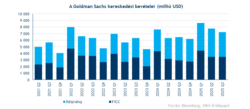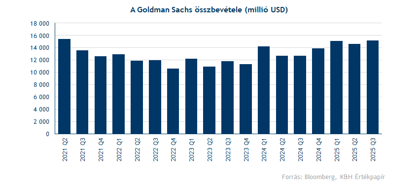Erős negyedévet tudott zárni a Goldman Sachs, az M&A piaci aktivitás újra felpörgött Q3-ban, ami a befektetési bank tanácsadói bevételeit is megdobta. Ugyanakkor az alacsonyabb piaci volatilitás közepette a részvénykereskedő részleg nem tudott olyan erősen teljesíteni, alulmúlva a piaci várakozásokat. Így a mai gyengébb piaci hangulat közepette a Goldman Sachs részvény sem találja az erőt, pedig az összteljesítmény nem volt gyenge a most zárult periódusban. A hosszabb távú kilátások is kedvezőek, a tanácsadói piacon láthatóan egyre nagyobb az aktivitás a gyenge 2023-2024-es időszak után, ami akár megalapozhatja a következő negyedévek teljesítményét.