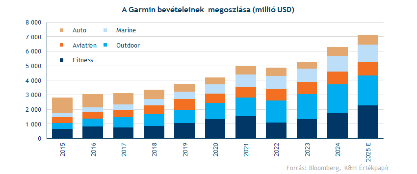 A Garmin bevételeinek túlnyomó részét okosórák értékesítéséből generálja, de egyéb sport- és szabadidős, illetve navigációs eszközöket is gyárt. A cég az alábbi szegmensekre bontja fel pénzügyi eredményeit: Fitnesz, Outdoor, Hajózás (Marine), Repülés (Aviation), és gépjárművek navigációja (Auto). A 2025-ben várható 7,1 milliárd dolláros összebevételének nagyjából 60 százalékát teszi ki a két legnagyobb, Fitnesz és Outdoor szegmens, de az operatív profit tekintetében már 75 százalékot tesz ki a két szegmens. Az utóbbi években jól látható, hogy a Garmin által kínált sportórák iránt megnövekedett a kereslet, így a Fitnesz és Outdoor szegmensek tudták a leggyorsabb növekedést felmutatni, de a többi szegmensben is rendre bővülést tudott elérni a cég.