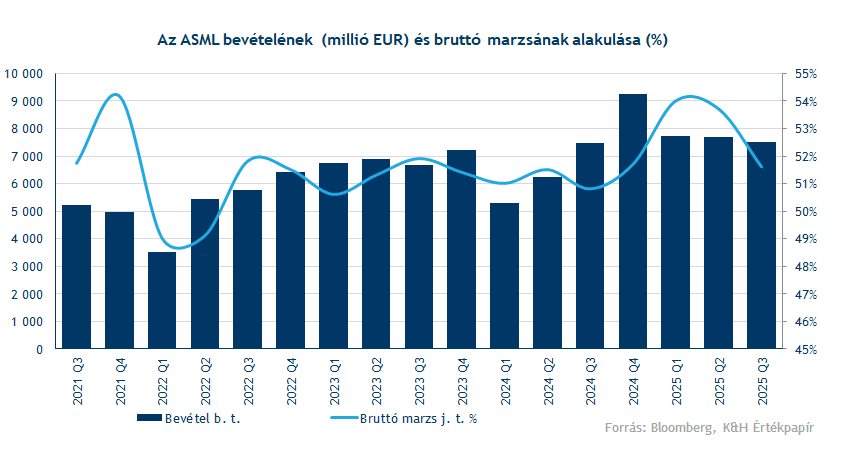 Az ASML harmadik negyedéves bevétele éves szinten stagnálást mutatott, a negyedévben elért 7,5 milliárd euró elmaradt a konszenzus által prognosztizált 7,7 milliárd eurótól. Ugyanakkor a nyereségesebb EUV (Extrém ultraibolya litográfiás chipnyomtatók) szegmens és az IBM szolgáltatási szegmens magasabb aránya az összbevételen belül enyhe pozitív meglepetést okozott az operatív profit szintjén, ami így 2,5 milliárd eurót tett ki, 51,6 százalékos bruttó marzs mellett. A negyedévben az igazított EPS 5,48 euró lett, ami 4 százalékos növekedést jelent a tavalyi szintekhez képest.