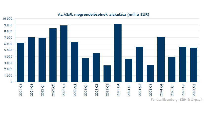 A befektetők kiemelt figyelmet fordítanak a nettó új megrendelések alakulására, mióta az ASML ebben a mutatóban 2025 első negyedévében csalódást keltő eredményeket közölt. Az idei harmadik negyedév azonban kellemes meglepetést hozott, ugyanis a megrendelésállomány 5,4 milliárd euróval nőtt (összhangban a második negyedévvel), ami meghaladta a piaci várakozásokat. Ezen belül az EUV litográfiás chipnyomtatókra vonatkozó megrendelések elérték a 3,6 milliárd eurót, ami így jóval felülmúlta a 2,2 milliárd eurós piaci becslést.