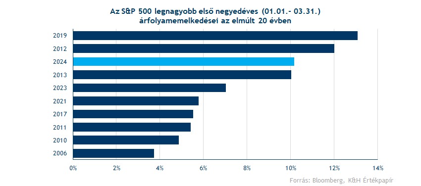 Tehát folytatódik a tavaly november óta tartó emelkedés az amerikai részvénypiacokon, az S&P 500 idén már 8 százalékot emelkedett. Az első három hónap teljesítményét nézve 2024 a harmadik legerősebb év az elmúlt 20 évben, egyedül 2012-ben és 2019-ben tapasztalhattunk erősebb évkezdést az amerikai részvénypiacon.