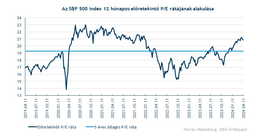 Az idei emelkedést követően egy másik megfontolandó kérdéskör a piacok értékeltsége. Ugyan az értékeltség inkább a hosszú távú hozamokra van erősebb kihatással, de a jelenlegi szintek mellett már megfontolandó, hogy nem-e túlárazott az amerikai részvénypiac. Az S&P 500 index 12 havi előretekintő P/E rátája az utóbbi hónapok emelkedését követően már a 21-es szint közelébe emelkedett, ami historikusan is magas szintnek számít, a 2021-2022 csúcsok környékén is hasonló szinteken járt a mutató. Persze a szektorok között változatlanul nagyobb különbség húzódik, a növekedési részvények túlsúlya egyes szektorokban magasabb értékeltségi mutatókkal párosul.