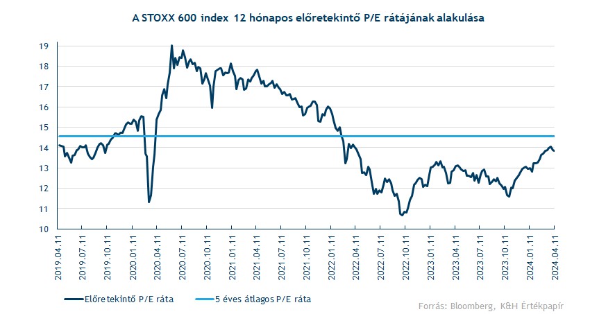 Változatlanul fennáll a helyzet, hogy az európai piacok árazottsága alulmúlja az amerikai piacét, igaz, mostanra már az európai részvények értékeltsége is magasabbra emelkedett a tavalyi szintekhez képest. A STOXX 600 index az utóbbi hetekben 14 körüli P/E mellett kereskedett, utoljára 2 év láthattunk hasonló értékeltségi mutatókat, bár ezek a szintek sem számítanak kiemelkedően magasnak, sőt. Az utóbbi 5, illetve 10 évben is 14,5 körül alakult az átlagos P/E szint, így ehhez képest még nem beszélhetünk az európai részvények túlértékeltségéről, így továbbra is inkább olcsónak tűnik Európa.