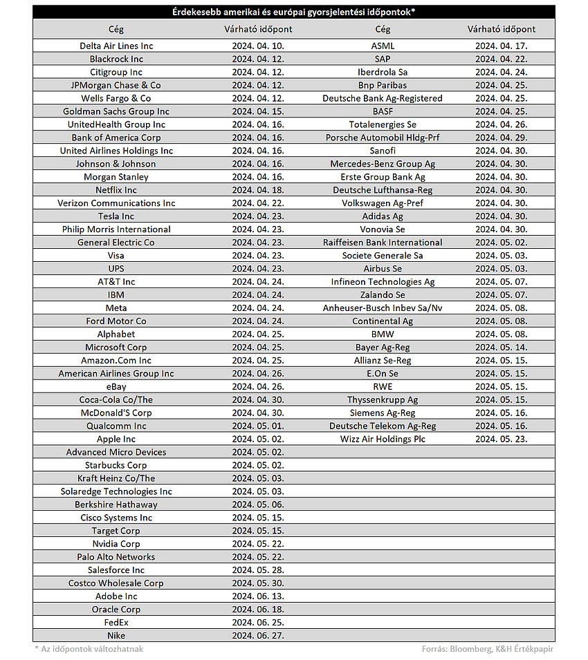 Nagyobb emelkedéssel kezdték az idei évet a részvénypiacok, azonban az elmúlt hetekben mintha megakadt volna a lendület a nagyobb amerikai és európai tőzsdeindexekben is. Továbbra is kérdéses, hogy a jegybankok mikor kezdhetik el a monetáris lazítást, ami nagyobb bizonytalanságot szült az utóbbi időben a piacokon. Így most a céges jelentésekre irányulhat a befektetői figyelem, az mozgathatja elsősorban a piacokat a következő hetek során. Amerikában úgy néz ki, hogy folytatódik a gazdasági növekedés, aminek köszönhetően az idei első negyedéves vállalati eredményekben is további javulás várható. Európa egyelőre még lemaradó maradhat, a csökkenő inflációs folyamatok nem igazán kedveznek a céges bevételeknek, valamint az európai gazdaságok teljesítménye is lemaradó.