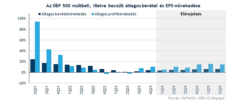 Mindenesetre 2024-ben is folytatódhat a javuló tendencia a céges számok tekintetében, a Refinitiv előrejelzése szerint az S&P 500 komponenseinek bevételei az első negyedév során átlagosan 3 százalékkal emelkedhettek. Ez egyébként még alacsonyabb a márciusi éves inflációnál, ebben a kontextusban tehát nem egy kifejezetten erős várakozásról beszélhetünk, de az év hátralévő részében még további javulásra van kilátás, akár 4 százalék feletti bevételnövekedéssel. Profit téren is hasonló trend mutatkozik, a várakozások itt átlagosan 5 százalékos javulást jeleznek előre az első negyedévben.