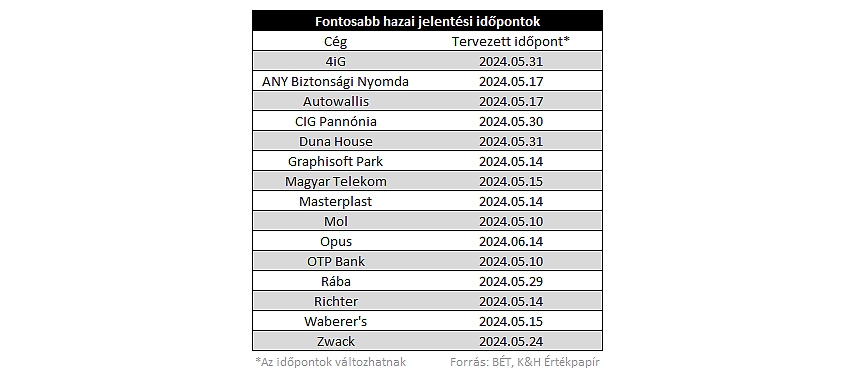 A négy kiemelt társaság május első felében teszi közzé a friss számait, viszonylag rövid időn belül mindegyik jelentésről lehull a lepel, hiszen május 10-én hajnalban az OTP, valamint a Mol gyorsjelentésére is figyelhetnek a befektetők. Ezt követően 14-én a Richter, majd végül 15-én a Telekom hozza nyilvánosságra a számait. Emellett kiemelendő, hogy az éves közgyűlésekre a következő hetek során kerülhet sor, itt dönthetnek a kifizetendő osztalékok sorsáról az arra jogosultak.