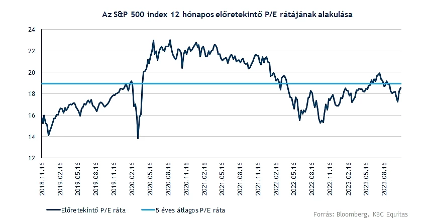 Ugyan azt bátor lenne kijelenteni, hogy jelenleg alulértékelt az amerikai piac, hiszen az S&P 500 index 12 havi előretekintő P/E rátája 18,3-es értéket jelez. Ugyan az 5 éves historikus átlaghoz képest némi diszkont mutatkozik, de jelentős eltérésről nem beszélhetünk, így azért nagyon túlértékeltnek sem tűnik a piac. Látható, hogy az eredmények és kilátások fokozatos emelkedése az árfolyamok stagnálása mellett csökkenő értékeltséget hozhatna, így tér van még felfelé a részvények előtt.