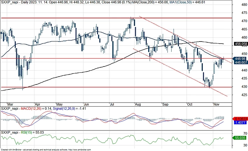 Továbbra sem mutatnak sok erőt az európai piacok, október második felében már a márciusi mélypontig is visszasüllyedt a STOXX 600 index árfolyama, egészen a 430 pontos szintig. Ezt egy visszapattanás követte, miután a piaci szereplők már a kamatok tetőzését kezdték el beárazni. Viszont nem sikerült egyelőre az 50 napos mozgóátlagot átvinnie az árfolyamnak, emellett a csökkenő trendcsatorna felső szára is sértetlen maradt, így talán még korai lenne egyértelmű emelkedő trendről beszélnünk az index kapcsán.