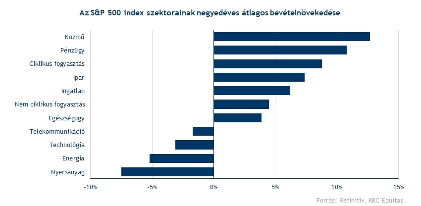 A többi szektor esetében már javulás volt látható a tavalyi bevételekkel összehasonlítva. A legnagyobb pozitív meglepetést a közmű cégek hozták, itt a szektor szereplőinek bevételei átlagosan több mint 12 százalékkal nőttek éves szinten, míg előzetesen csak 3 százalékos bővülést vártak az elemzők. Emellett a fogyasztási cikkeket értékesítő cégek is erős negyedévet tudhatnak maguk mögött, az amerikai munkaerőpiac láthatóan erős tudott maradni, így nem esett vissza a lakossági fogyasztás sem.