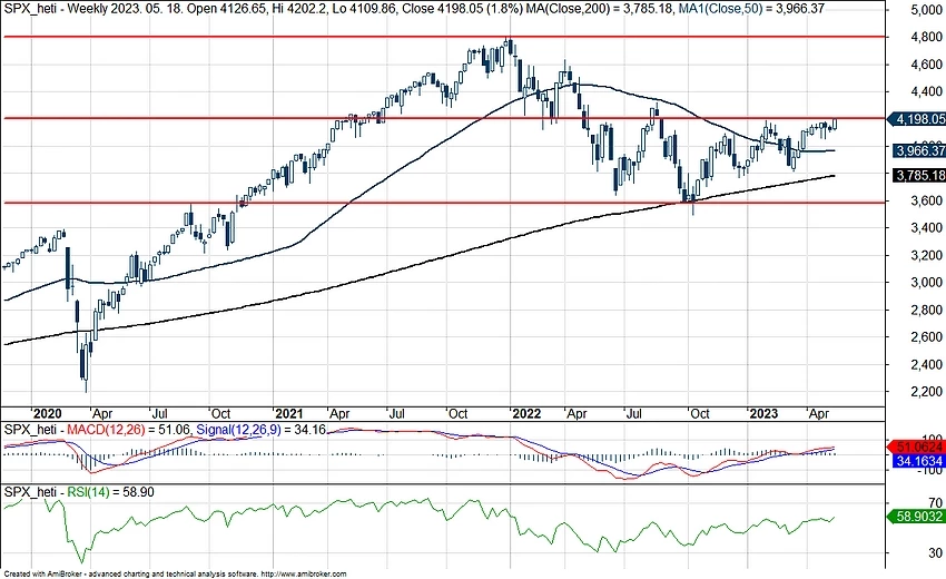 Az S&P 500 index heti grafikonja (2023. 05. 19. nyitás előtt)