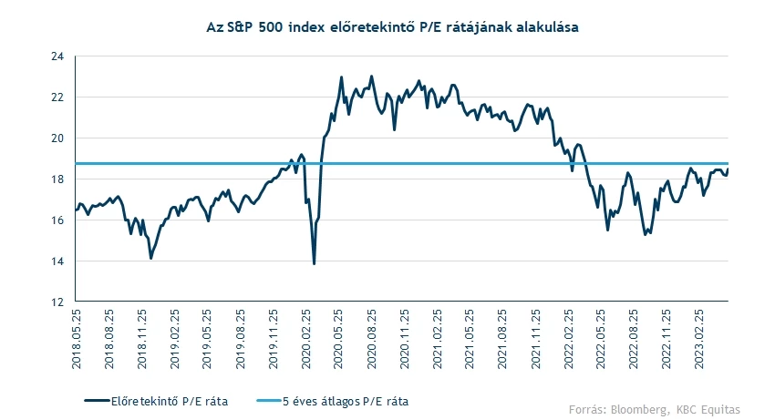 A piaci hangulat javulásával az S&P 500 index értékeltsége is magasabb szintre emelkedett az utóbbi hetekben, az egy éves profitvárakozások nem tudták egy az egyben lekövetni az árfolyamok emelkedését, így az index 12 hónapos előretekintő P/E rátája már 18,5-ös értéket mutat. Utoljára tavaly áprilisban volt hasonló szinteken az index értékeltsége. Azért attól még messze vagyunk, hogy túlértékelt szintekről beszéljünk most, hiszen a gazdasági környezet is sokat javult az elmúlt félév során, az infláció továbbra is csökkenő pályán mozog, míg a fogyasztás nem esett vissza jelentős mértékben.