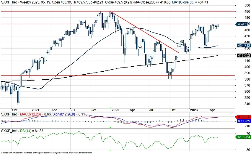 A STOXX 600 index heti grafikonja (2023. 05. 19. 14:00)
