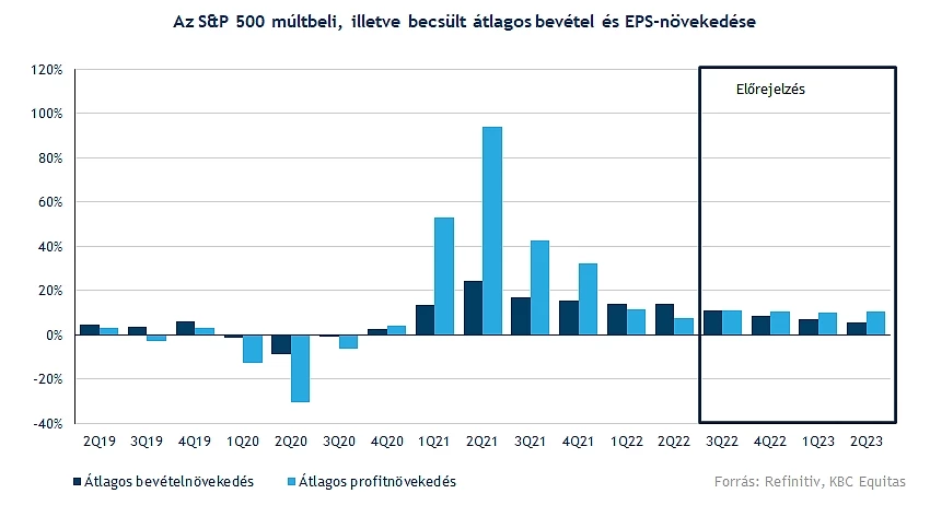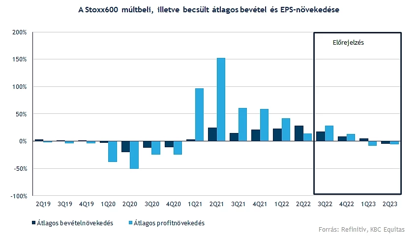 Szintén igaz az európai cégekre, hogy a bevételekben egyetlen szektorban sem volt látható csökkenés, viszont a profitabilitás csökkent, és a fogyasztási, a telekommunikációs, valamint a pénzügyi szektorban csökkent az EPS is. A költségnyomás tehát itt is látszódik, és a kilátásokat tekintve a következő időszakban szintén lassulhat a növekedés, míg 2023-ban már az EPS csökkenésére van kilátás, és a jelenlegi várakozások alapján a jövő év második felétől a bevételnövekedés üteme is mínuszba fordulhat.
