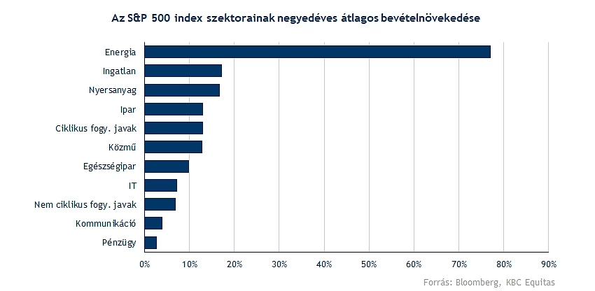 Az átlagos bevételnövekedés az S&P 500 esetében 13,9 százalékos volt, míg az EPS-növekedés 7,3 százalékos. Az élen szerepelt az energiaszektor (amellyel a későbbiekben bővebben is foglalkozunk), de a nyersanyag, ipar, egészségügy, közművek és az ingatlancégek esetében is nagyobb bővülés volt látható a bevételekben. Nem sokkal maradt le a technológiai cégek bevételnövekedése, viszont a pénzügyi szektorban, és a telekommunikációs cégeknél, valamint a tartós fogyasztási cikkek esetében alacsony volt a bevételnövekedés. Általánosságban tehát a bevételek növekedtek, amelyben a magasabb inflációs környezet is szerepet játszik, a profit növekedése azonban nagyobb változékonyságot mutat az egyes szektorok között.