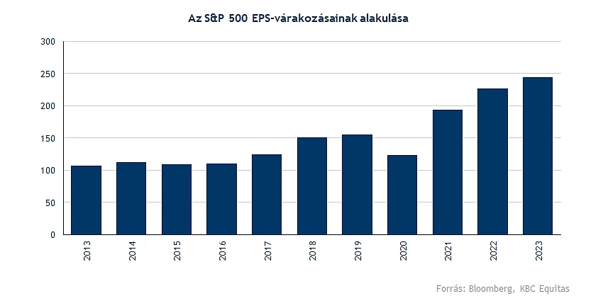 Érdemes megnézni a következő időszakokra vonatkozó várakozásokat is. Az alábbi ábrán az S&P 500-ra vonatkozó EPS becslések láthatóak, amely az összes indexben szereplő vállalat EPS-várakozásain alapul. Ez alapján az idei évben, illetve a következő évben is még növekvő EPS-sel lehet számolni (a jelenlegi feltételezések alapján). Mindez a mostani S&P 500 értékével összevetve a 2022-es évben várt EPS alapján 18,5-es, a 2023-as becsült EPS alapján pedig 17,2-es P/E rátát jelent.