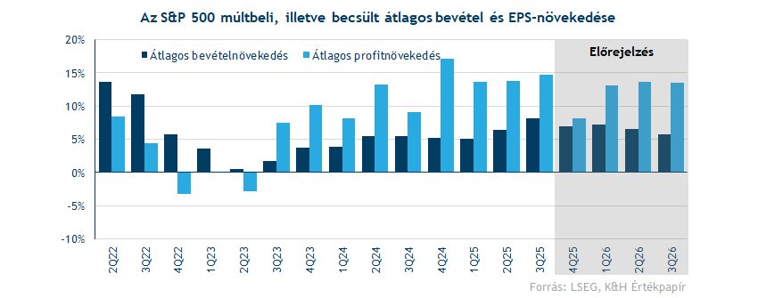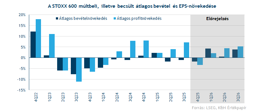 Profitok tekintetében viszont már markánsabb felülteljesítés mutatkozott, ami némi meglepetést okozhatott utólag. Úgy tűnik, előzetesen túl pesszimistává válhattak az elemzők az amerikai vámok negatív hatása kapcsán, de az európai cégek fel tudtak mutatni valamekkora alkalmazkodóképességet, legyen szó az előzetes készletezésről, logisztikai láncok átalakításáról vagy akár áremelésekről is. Így a STOXX 600 index komponensei átlagosan 7,1 százalékos profitnövekedést tudtak elérni a harmadik negyedév során, ami bőven meghaladta az előzetes várakozásokat.