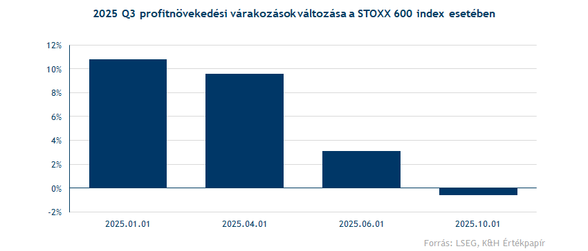 Az európai indexek esetében igen máshogy alakult a 2025-ös év, mint a tengerentúlon, hiszen éppen az év első hónapjai sikerültek erősebben, május óta viszont már nem tudtak érdemi emelkedést felmutatni a nyugat-európai indexek. Az amerikai vámok ugyanis jelentősen átírták a befektetői várakozásokat, ami a részvényárfolyamokra sem volt pozitív hatással. Az európai gazdaságokra vonatkozó vámok bejelentése után az elemzők is elkezdték visszavágni profitvárakozásaikat az idei harmadik negyedéves eredmények kapcsán. Ugyanakkor azt követően sem emelkedtek az elemzői várakozások, miután az EU és az USA között megszületetett a kereskedelmi egyezség még augusztusban. Míg az év elején 12 százalék körüli profitemelkedéssel számolt az elemzői konszenzus a STOXX 600 index kapcsán a harmadik negyedévre vonatkozóan, addigra októberre már csak 0 százalék körül változással számoltak. Tehát nem tették igazán magasra a lécet az elemzők az európai jelentések kapcsán.