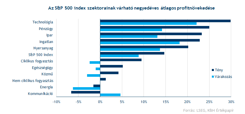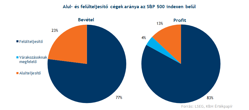 Az S&P 500 indexet alkotó 500 cég túlnyomó többsége tehát már közzétette harmadik negyedéves jelentését, és összességében azt láthattuk, hogy bevételek és nettó profit tekintetében is felülteljesítő volt a cégek többsége. Bevételek terén a jelentő cégek háromnegyede tudott a vártnál erősebb számokat közzétenni a harmadik negyedéves riportjában, profitok terén viszont már 83 százalék volt a felülteljesítők aránya.