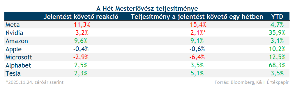 Nem sok panasza lehetett a piaci szereplőknek a harmadik negyedéves eredményekre, Amerikában továbbra is az AI kapja a főszerepet, ennek kapcsán a nagy felhőszolgáltatók és chipgyártók változatlanul erős pénzügyi eredményekkel büszkélkedhetnek, de a többi szektor kapcsán is vártnál erősebb eredményeket láthattunk. Az utóbbi hetekben ugyan nem remekelt az amerikai részvénypiac, de a céges eredmények inkább támogatóak voltak. Európában vegyes időszakon vagyunk túl, a bevételcsökkenés ugyan folytatódott a második negyedév után, de profitok terén a felülteljesítés volt a jellemző. Úgy tűnik, az amerikai vámokra a vártnál talán jobban tudtak reagálni az európai cégek.