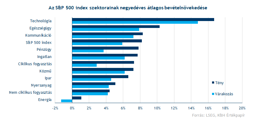 Az S&P 500 index legnagyobb hányadát a technológiai szektor teszi ki, így a szektorok között érdemes itt kezdeni a gyorsjelentési összefoglalónkat. A techszektor kapcsán előzetesen majdnem 15 százalékos bevételnövekedés szerepelt az elemzői várakozásokban, de végül ezt a magas lécet is sikerült megugrania a szektornak. EPS tekintetében pedig 30 százalékos növekedést sikerült elérni, ami szintén meghaladja az előzetes várakozást. Így nem meglepő módon továbbra is a techszektor a húzó iparág az Egyesült Államokban, ahol az AI beruházási hullám egy újabb fokozatba kapcsolt a harmadik negyedévben.