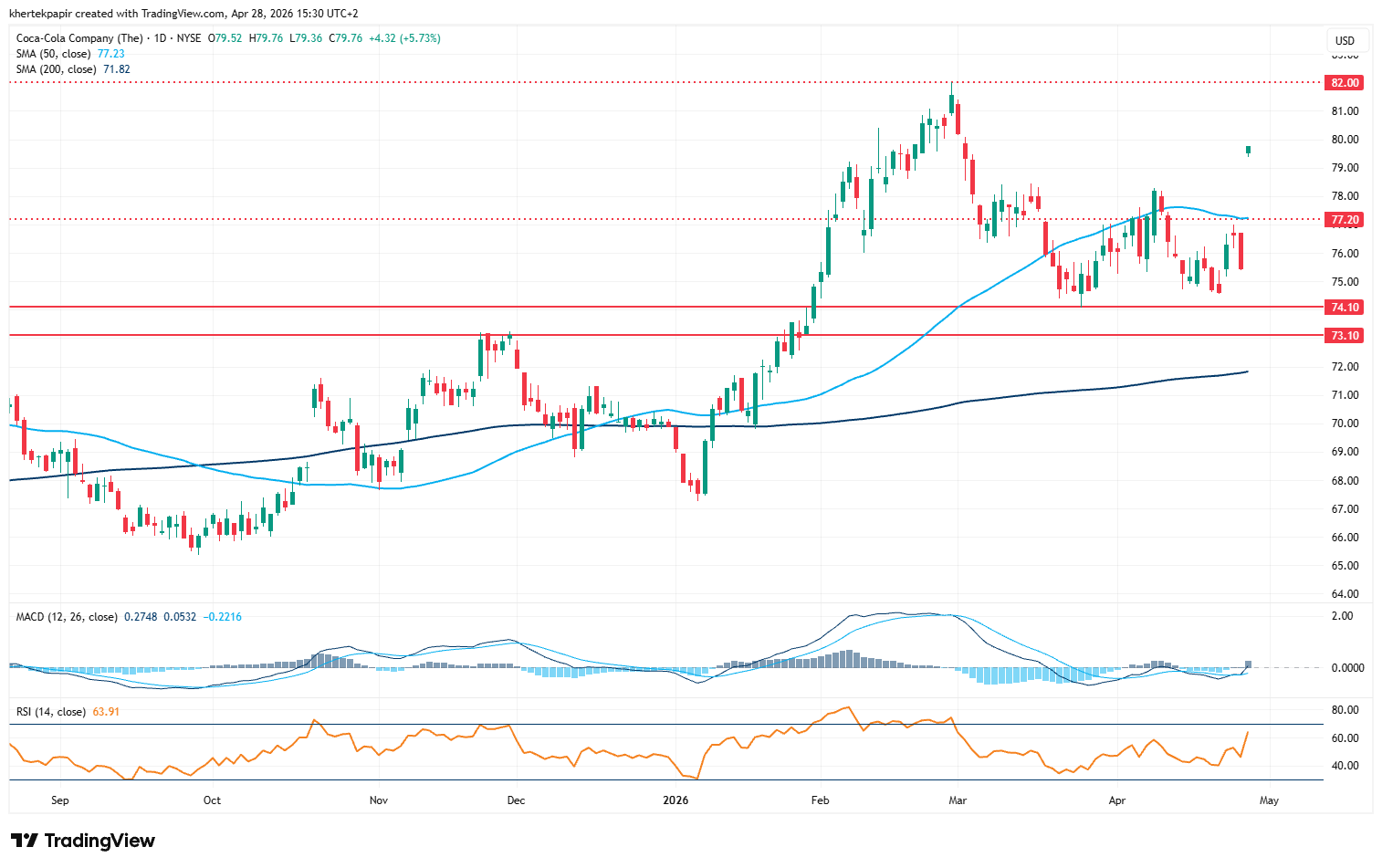 Kedvezően fogadta a piac a Coca-Cola friss gyorsjelentését, az 50 napos mozgóátlag felett nyitott a részvény. Az elmúlt hetek során ez a mozgóátlag már tesztelésre került, az árfolyam azonban tartósan nem tudta áttörni, így a további javuláshoz és az idei 82 dolláros csúcs eléréséhez elsőként ennek az ellenállásnak tartós leküzdésére lenne szükség.