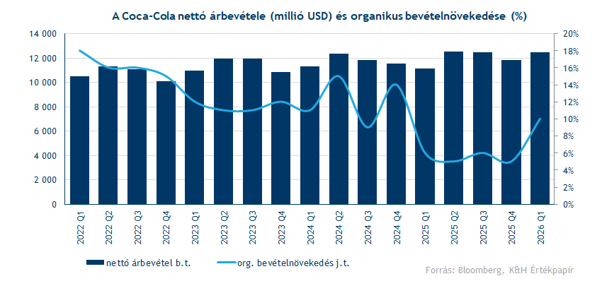 Az idei évre változatlanul 4-5 százalék körüli organikus bevételnövekedéssel kalkulál a menedzsment, míg összehasonlítható EPS kapcsán már 8 és 9 százalék közötti javulással számolnak az idei évre, amely optimistább a korábban kitűzött 7-8 százalék körüli növekedési célnál. Ezek alapján tovább haladhat a stabil, egy számjegyű növekedés útján a Coca-Cola, miközben az erős cash flow termelés, és az évek óta tartó részvényesi juttatások fenntartása a befektetők számára is kedvezően hathat. Ezen felül a volatilis piaci környezetben a defenzívebb, alacsony bétájú részvények kisebb kilengéseket produkálhatnak.