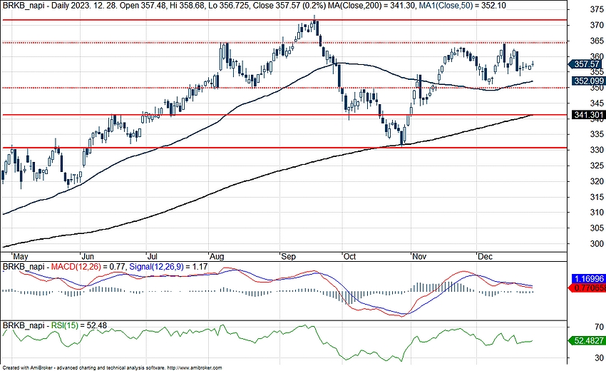 Az árfolyam a mozgóátlagok mentén tovább menetelhetne felfelé, ellenállást a 364 dolláros szint képezhet, ez az utóbbi időben többször is gátat szabott a részvény emelkedése előtt. Feljebb még a történelmi csúcsot kijelölő 370 dollár feletti szintek jelenthetnek akadályt. Ezzel szemben a 350 dolláros szint, vagy a 331 dolláros zóna támaszként üzemelhet, amely gyengébb piaci hangulat közepette is kisegíthetné a részvényt. Az indikátorok sem tartózkodnak kritikus szinteken, így kedvező helyzetből vághat neki az új évnek a Berkshire Hathaway.