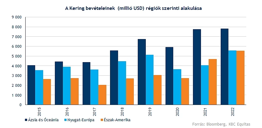 Érdemes a régiók szerinti bontást is megvizsgálni, hiszen jól látható, hogy az évek során egyre nagyobb hangsúlyt fektetett a cég az ázsiai régiókra. 2020-ban láthattunk visszaesést az ázsiai területeken, illetve tavaly is megakadt a növekedés üteme. Várhatóan az idei év már több jóval kecsegtethet, hiszen a kínai újranyitás hatására a vásárlások is felpöröghetnek az ázsiai országban, ebből pedig a Kering jelentősen profitálhat.