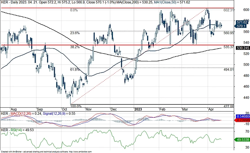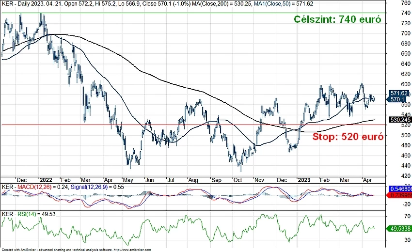 Az idei évet meggyőzően kezdte a részvény is, azonban a januári/februári csúcsok némi ellenállást tanúsítanak jelenleg az árfolyam emelkedése előtt. Így az 536-600 euró körüli sávban ragadt a részvény, az ebből való kitörést követően nyílhatna meg igazán az út felfelé. Emellett látni kell, hogy a fontos Fibonacci-szintnek felel meg az 536 eurós támasz, így ez akár hosszabb távon is segítséget nyújthatna, majd a hangulat javulásával szárnyalásnak indulhatna ismételten a papír.