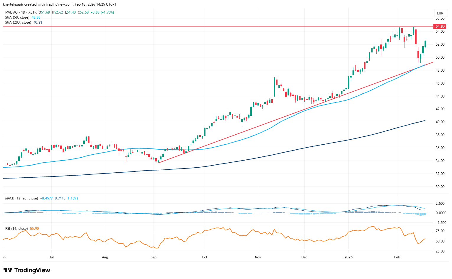 Röviden összefoglalva, az energiacégeket érintő kedvező trendek továbbra is fennállhatnak, ezek közé tartozik az AI‑infrastruktúra által generált hatalmas kereslet. Emellett a német közműszektort érintő strukturális támogatások is egyaránt segíthetik a céget. Az RWE befektetői a közelgő gyorsjelentésre figyelhetnek majd, amely várhatóan március 12-én piacnyitás előtt érkezik, és amelyben a 2025-ös üzleti év eredményeit ismerteti a társaság.