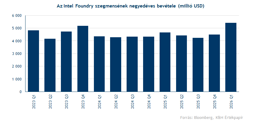 Az Intel másik legjobban teljesítő üzletága a bérgyártási (Foundry) üzletág, ami kiemelt stratégiai helyzettel bír, ugyanis gyakorlatilag az Intel az egyetlen amerikai piaci szereplő, amely rendelkezik azzal a fejlett bérgyártókapacitással, amely képes kielégíteni az AI-fűtötte keresletet. A Foundry üzletágban a bevétel éves növekedési üteme a 2025 negyedik negyedévi 4 százalékról 2026 első negyedévére 16 százalékra gyorsult fel. Az így elért 5,4 milliárd dolláros bevétel már meg is haladta az adatközponti divízió 5,1 milliárd dolláros bevételét.