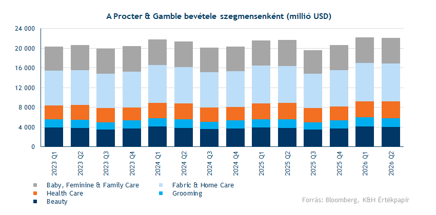 A Procter & Gamble rendkívül széles termékportfólióval rendelkezik a fogyasztási cikkek piacán. Az elmúlt negyedévben a szegmensek nettó eladásait és organikus bevételnövekedését tekintve a szépségápolási és egészségügyi termékek szegmense teljesített kiemelkedően, miközben a Baba-, Női- és Családhigiénia kategória maradt el leginkább a várakozásoktól. A gyengébb teljesítményt a baba- és női higiéniai termékek csökkenő értékesítési volumene, valamint a családi termékek tavalyi évi készletfelhalmozásából származó kedvezőtlen bázishatás okozhatta.