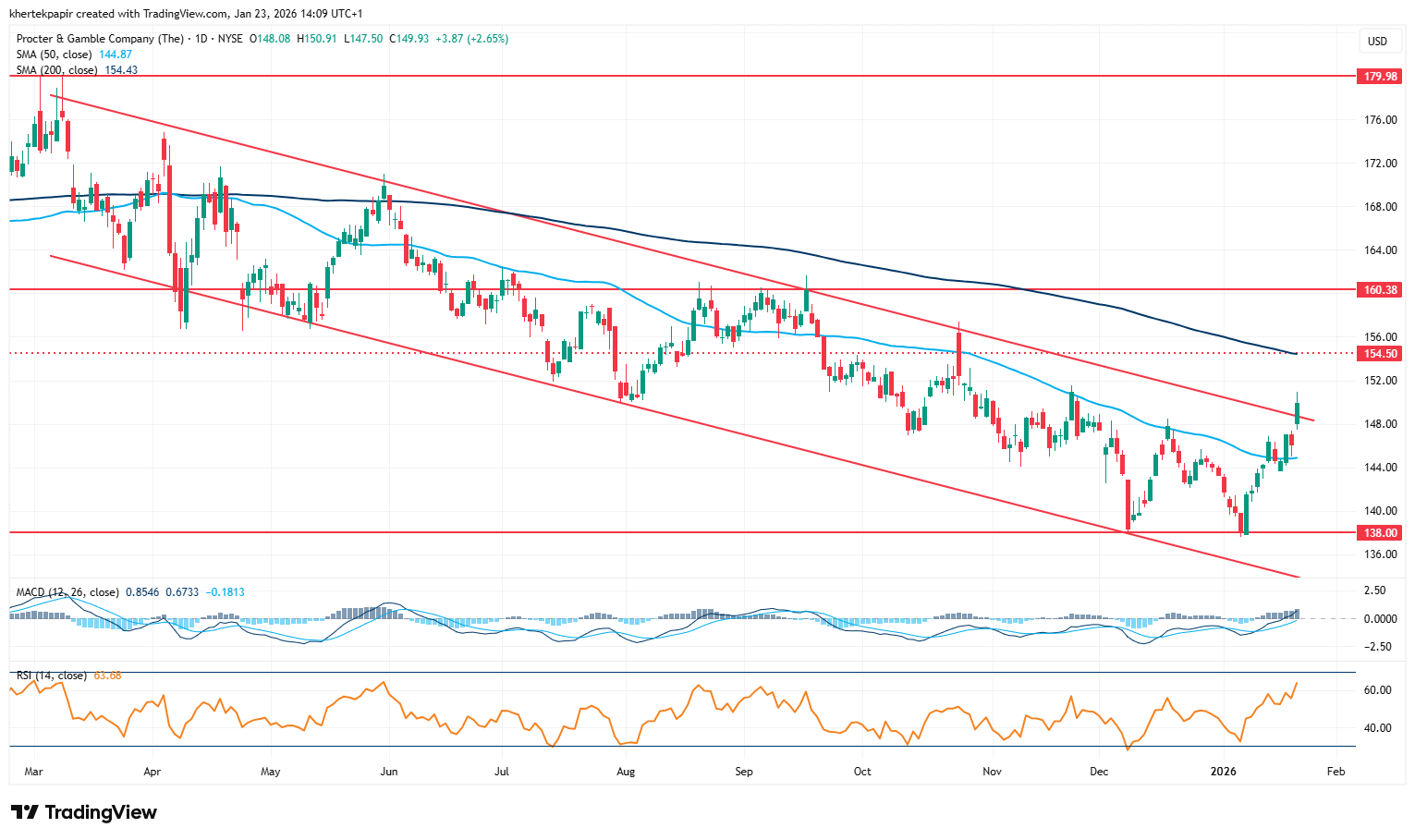 Bár vegyes eredményeket közölt a Procter & Gamble tegnapi jelentésében, a vezetőség optimistán nyilatkozott a jövőbeli teljesítményt illetően, az előrejelzések szerint a vállalat túl van a nehezebb időszakon, és erősen alakulhat a 2026-os üzleti év. A részvényárfolyam így technikai szempontból kedvező szintekre érkezett a pozitív piaci fogadtatást követően, áttörve csökkenő trendvonalát. Amennyiben kitart az emelkedés, több fontos ellenállási szintet is tesztelhet az árfolyam, miközben a stabil osztalékfizetőnek számító részvény továbbra is az alulértékeltség jeleit mutatja.
