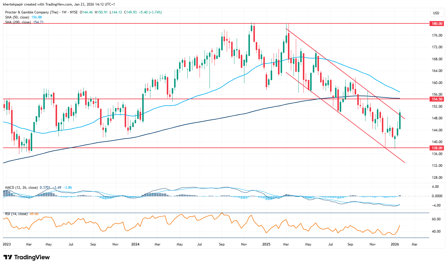 Heti bontásban jól látszik, mennyire nyomott szintekre süllyedt vissza a Procter & Gamble részvénye az elmúlt években, az árfolyam lecsorgását végül a 138 dollár körüli szint állította meg, ahol legutóbb 2023-ban járt a papír. Az árfolyam ezt követően sikeresen elindult a 200 hetes mozgóátlag irányába, amelyet 155 dollár környékén tesztelhet, miközben a 138–141 dollár közötti zóna jelenthet erősebb támaszt a továbbiakban. A heti indikátorok közül az MACD éppen vételi jelzésre váltott.