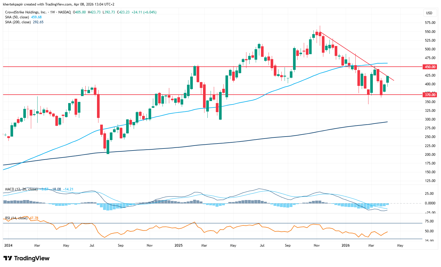 A heti grafikonon is látható, hogy a 450 dolláros szint még markáns ellenállást állít a CrowdStrike grafikonján, azonban az indikátorok a heti grafikon alatt is kedvező képet mutatnak. Az MACD jelzése ugyan még nem fordult át vételbe, de egyre közelít egymáshoz a szignál és az MACD vonal, amit jellemzően vételi jelzés követ. Ezen kívül az RSI túladott szintek közeléből kezdett el felfele trendelni, de egyelőre semleges szinteken tartózkodik. Az indikátorok mellett még az is kedvező technikailag, hogy a 370 dollár körüli zóna láthatóan idén már második alkalommal tudott védelemmel szolgálni, megerősítve ezt a támaszzónát.