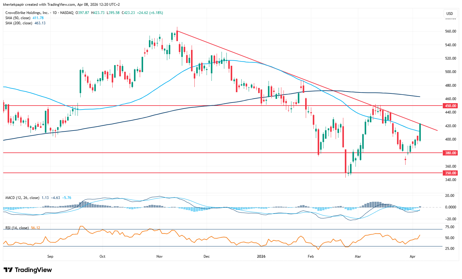 Egyelőre viszont inkább a pozitív fordulatot erősíti meg a technikai kép, így azt is érdemes megvizsgálni, milyen szintek jelenthetnek akadályt rövid távon. A legközelebbi ellenállási zóna 450 dollár környékén húzódik meg, amit még március közepén nem tudott átugrani az árfolyam. Feljebb pedig a 200 napos mozgóátlagot lehet kiemelni, ami korábban fontos támaszként funkcionált. Tér tehát mutatkozik az emelkedés folytatására a negatív trendvonal áttörését követően, viszont a tartós emelkedés folytatásához a fentebb említett ellenállási szinteket is át kellene törnie a CrowdStrike részvényének.