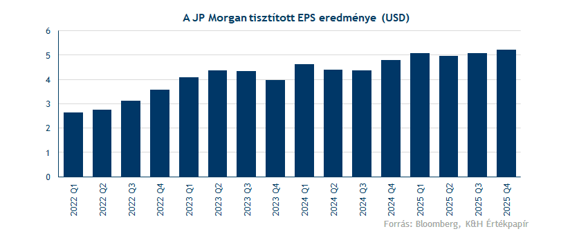 Pár hete tette közzé negyedik negyedéves eredményeit a nagybank, amely továbbra is rendkívül tőkeerős, robusztus mérleggel rendelkezik. Az elmúlt, októbertől december végéig tartó negyedévben összességében bevétel és EPS-soron is megfelelt a várakozásoknak a JP Morgan. Az előzetes 46,35 milliárd helyett 46,77 milliárd dollár lett a negyedéves bevétel, miközben a tisztított EPS 5,23 dollár lett a várt 4,86 dollárral szemben.