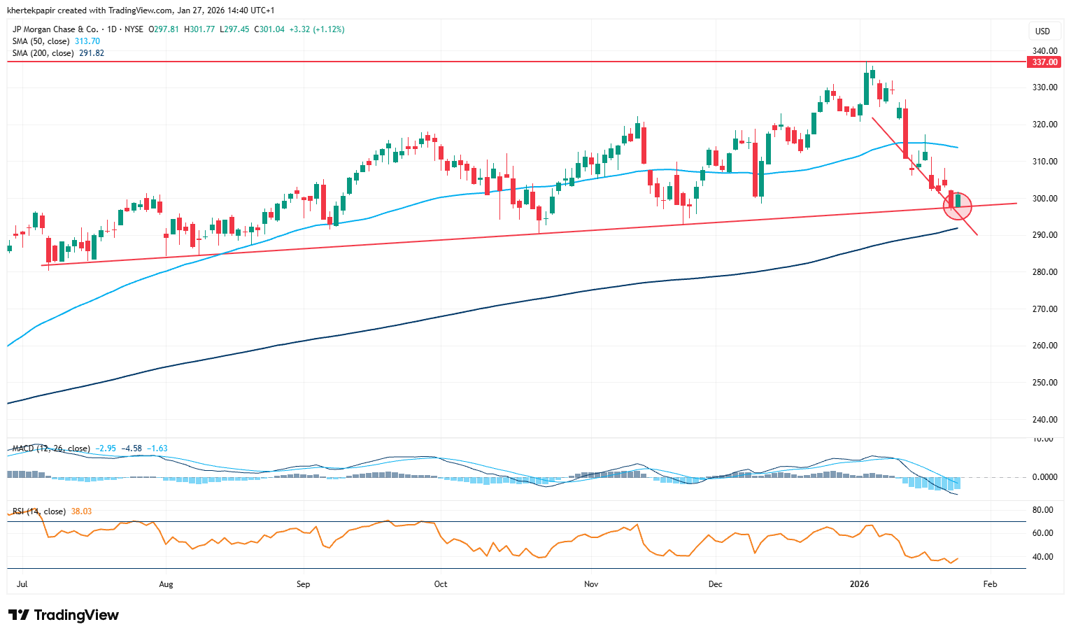 Technikailag a bankpapír árfolyamát egy július óta tartó emelkedő trendvonal támogatja az 50 napos mozgóátlag mellett. Ez a trendvonal jelenleg ismét tesztelés alatt áll, és egyelőre sikeresen tartja az árfolyamot. A részvény tavaly év végén 337 dollárnál állított be új csúcsot, az 50 napos mozgóátlaggal együtt ez a szint azonosítható fontos ellenállásként. A jelenlegi 300-301 dolláros támasz letörése esetén a 292 dollárnál húzódó 200 napos mozgóátlag nyújthat további védelmet. Az indikátorok közül az RSI a túladott tartományhoz közelít, míg az MACD a rövid távon kialakult csökkenő trendet erősítette meg.