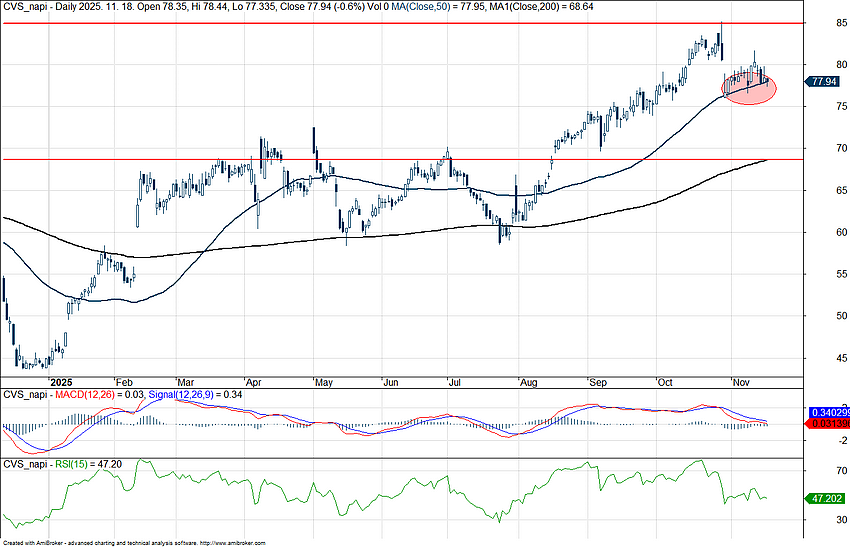 Technikailag izgalmasan fest a CVS Health napi grafikonja, az árfolyam ismét az 50 napos mozgóátlagát tesztelheti, amely az utóbbi hetekben sikeres támaszként szolgált. Az árfolyam további mozgásának szempontjából kulcsfontosságú lehet ez a szint; letörés esetén a 200 napos mozgóátlag lenne a következő támasz, míg felpattanás esetén ellenállást az idei 85 dolláros csúcs jelenthet. Az indikátorok közül a 85 dolláros szint elérése után az MACD eladási jelzést adott, míg az RSI semleges szintekre korrigált.