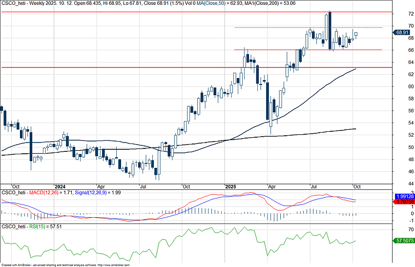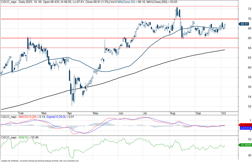 A legutóbbi gyorsjelentését követően oldalazó trendbe került a Cisco részvénye, az árfolyam a tartomány felső határa felé indult el, amelyet korábban már többször is tesztelt. Egyelőre támogató a piaci hangulat a Cisco körül, a vállalat stabil növekedést mutat, ráadásul az alulértékeltség jeleit kezdi mutatni a versenytársakhoz képest. Az AI megrendelések a jövőben is segíthetik a céget, így érdemes lesz figyelni, hogy vajon sikerül-e az árfolyamnak áttörni a lélektani 70 dolláros ellenállási szintet a következő időszakban.