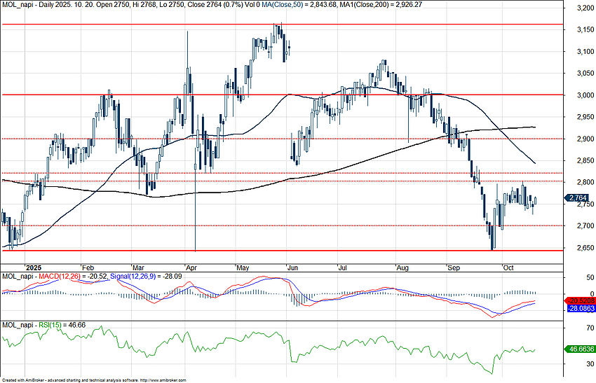 Az elmúlt napok során inkább oldalazás jeleit mutatta a Mol, így a 2700 és 2800 forintos szintek közé szorult be, emellett az 50, valamint a 200 napos mozgóátlag képezhetne még ellenállást feljebb. A piaci hangulat támogató, azonban nagy lendületet egyelőre nem tud venni a Mol, ebben a gyengébb energiaárak is akadályt képezhetnek, de látható, hogy a nemzetközi piacokon sem tudnak kiemelkedően teljesíteni az energiacégek. Nagyobb impulzust a novemberben érkező negyedéves gyorsjelentés adhatna.