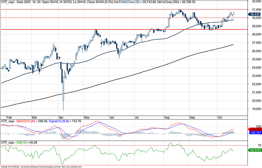 Folytatni tudta erősödő trendjét az OTP részvénye, így már az 50 napos mozgóátlag sem korlátolja be a papír teljesítményét. A hétfői kereskedést is emelkedéssel indította a részvény, így az árfolyam már a 31 ezer forintos csúcsszintet közelíti. Az RSI még nem érte el a túlvett szinteket, míg az MACD változatlanul vételi jelzést mutat. A nagy amerikai banki jelentések már lementek, a következő hetekben már az európai banki szereplőkre lehet figyelni, míg az OTP jelentése majd november 7-én érkezik.
